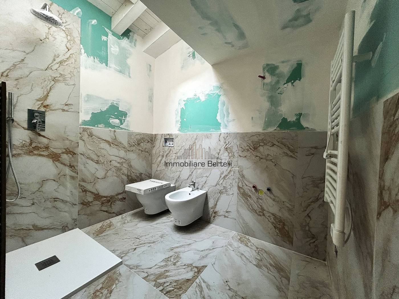 Struttura e isolamento: nuova copertura con isolamento acustico e termico, murature esterne ed interne ad alta efficienza energetica - Serramenti esterni: finestre in alluminio con taglio termico e vetro camera - Porte interne: battenti in legno, effetto liscio bianco 80x210 cm con serrature e maniglie - Impianto idraulico: tubazioni Geberit Silent o simili, attacchi per lavastoviglie e lavatrice - Bagno: sanitari sospesi Azzurra, piatto doccia in marmo resina 70x100 cm, rubinetteria Paffoni serie Red, aspirazione forzata - Pavimenti e rivestimenti: grès porcellanato di fascia medio-alta, formato 60x120 cm ❄️ Impianti termici: pompa di calore aria-aria multi-split, boiler ibrido Ariston Lydos Hybrid, scalda salviette nei bagni ⚡ Impianto elettrico: Bticino serie Matix o simile, prese TV, telefono, elettrodomestici, videocitofono, campanello, applique esterne